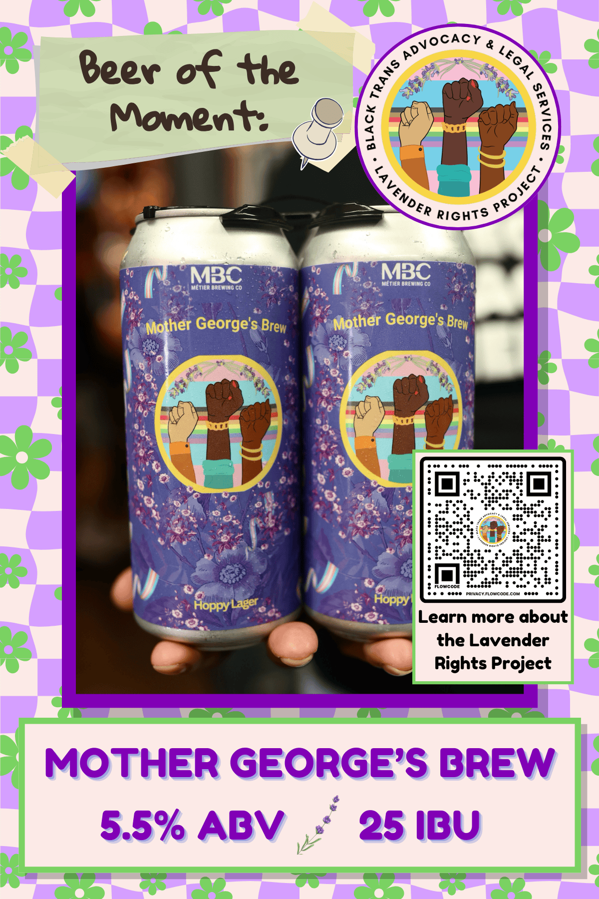 Proceeds from the sales of this beer support Lavender Rights Project (LRP), which elevates the power, autonomy, and leadership of the Black intersex and gender-diverse community through intersectional legal and social services. Learn more and support LRP at lavenderrightsproject.org.